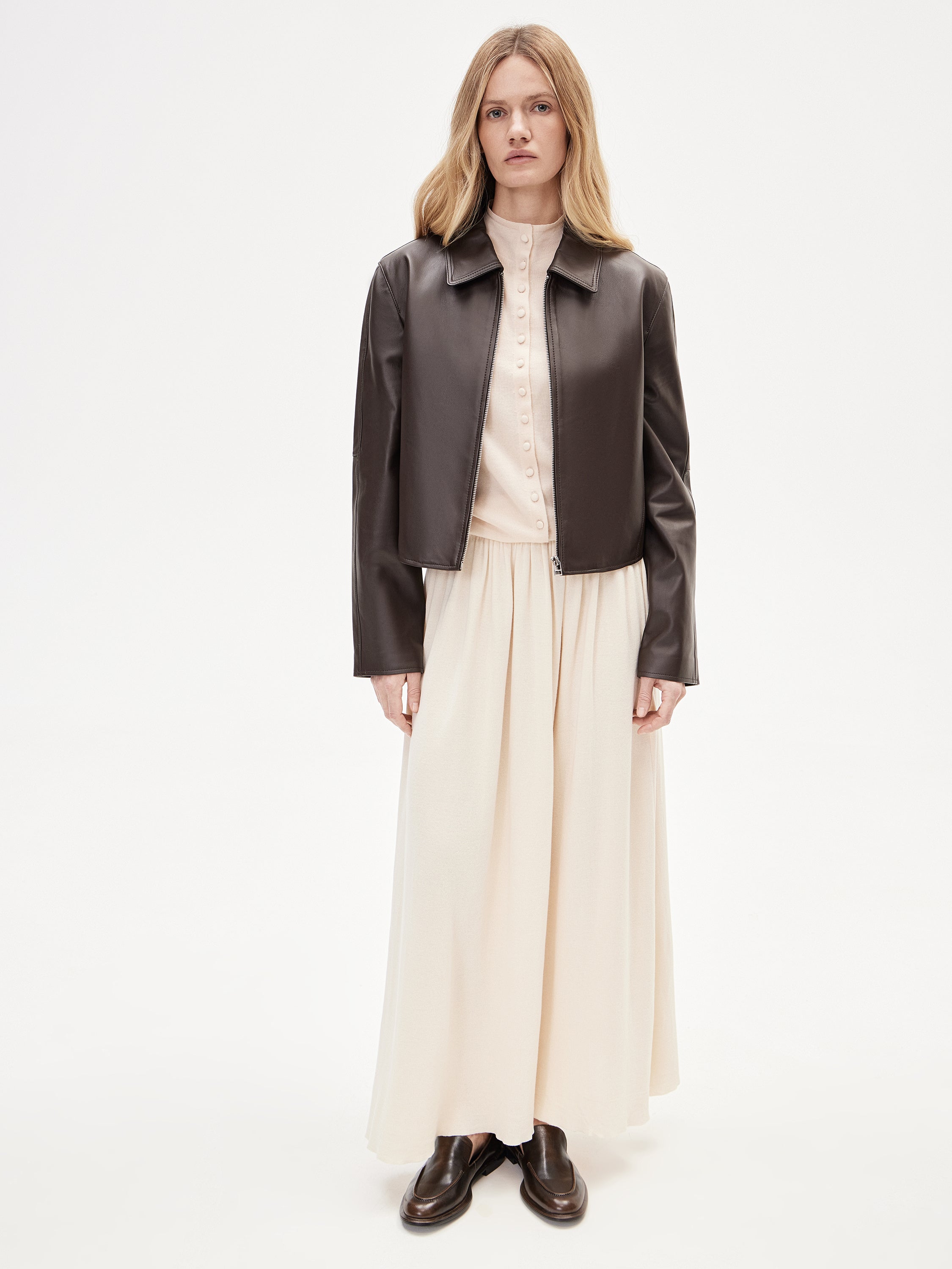 A refined jacket crafted from genuine leather, designed with a clean, cropped silhouette. The smooth surface has a soft, subtle sheen that highlights the natural texture of the leather. The construction is centered around a front zip closure and carefully placed seam lines that shape the silhouette and add a graphic edge without feeling rigid. Discreet welt pockets are seamlessly integrated into the design, maintaining the purity of the form. A classic collar and straight sleeves complete the look, giving the piece a balanced and understated character. Easy to style, this jacket works effortlessly across both everyday and more polished outfits, making it ideal for transitional layering.