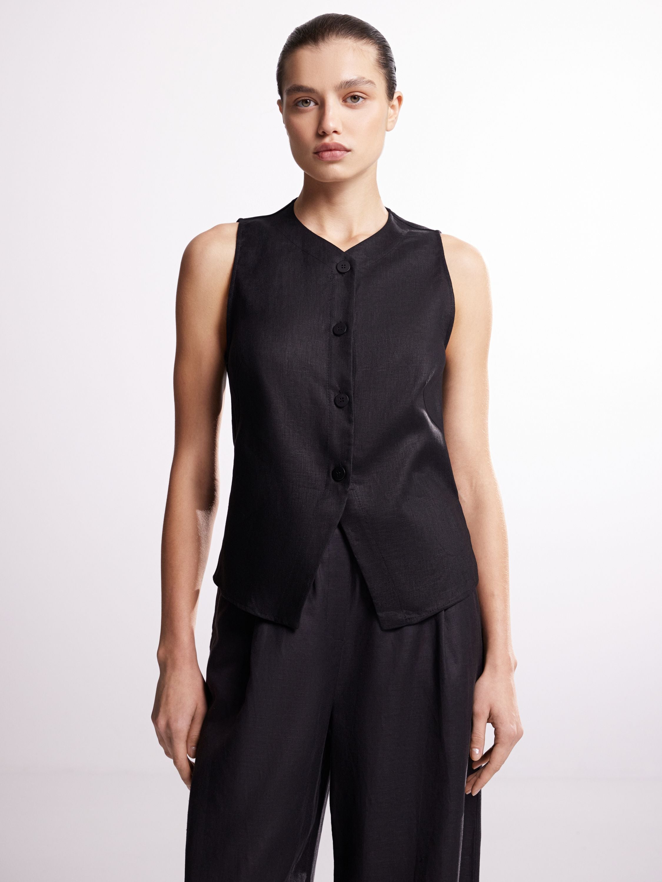 A minimalist waistcoat with a refined silhouette, crafted from dense linen with a subtle texture. Designed with a straight cut, a deep V-neckline, and a statement button placket for a clean, versatile look. The shaped hem at the front adds a touch of architectural structure. Tailored darts enhance the fit, allowing the piece to be styled both formally and casually — paired with a skirt, trousers, or shorts.