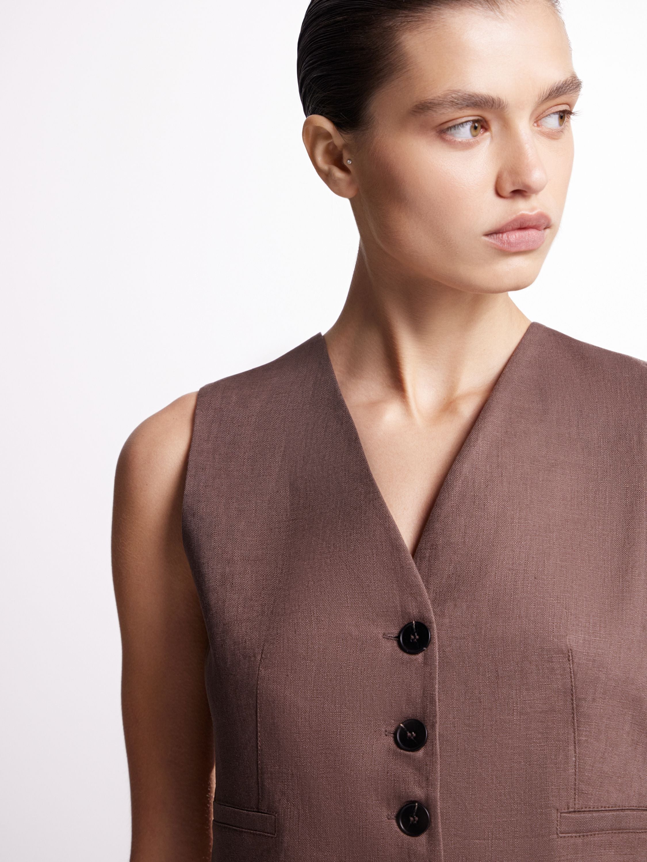 A tailored fit is shaped through darts and a subtly cinched waist, with the shoulder and armhole designed for versatility — wear it on bare skin or layered. Contrast buttons highlight the vertical line, bringing a polished finish to the piece.