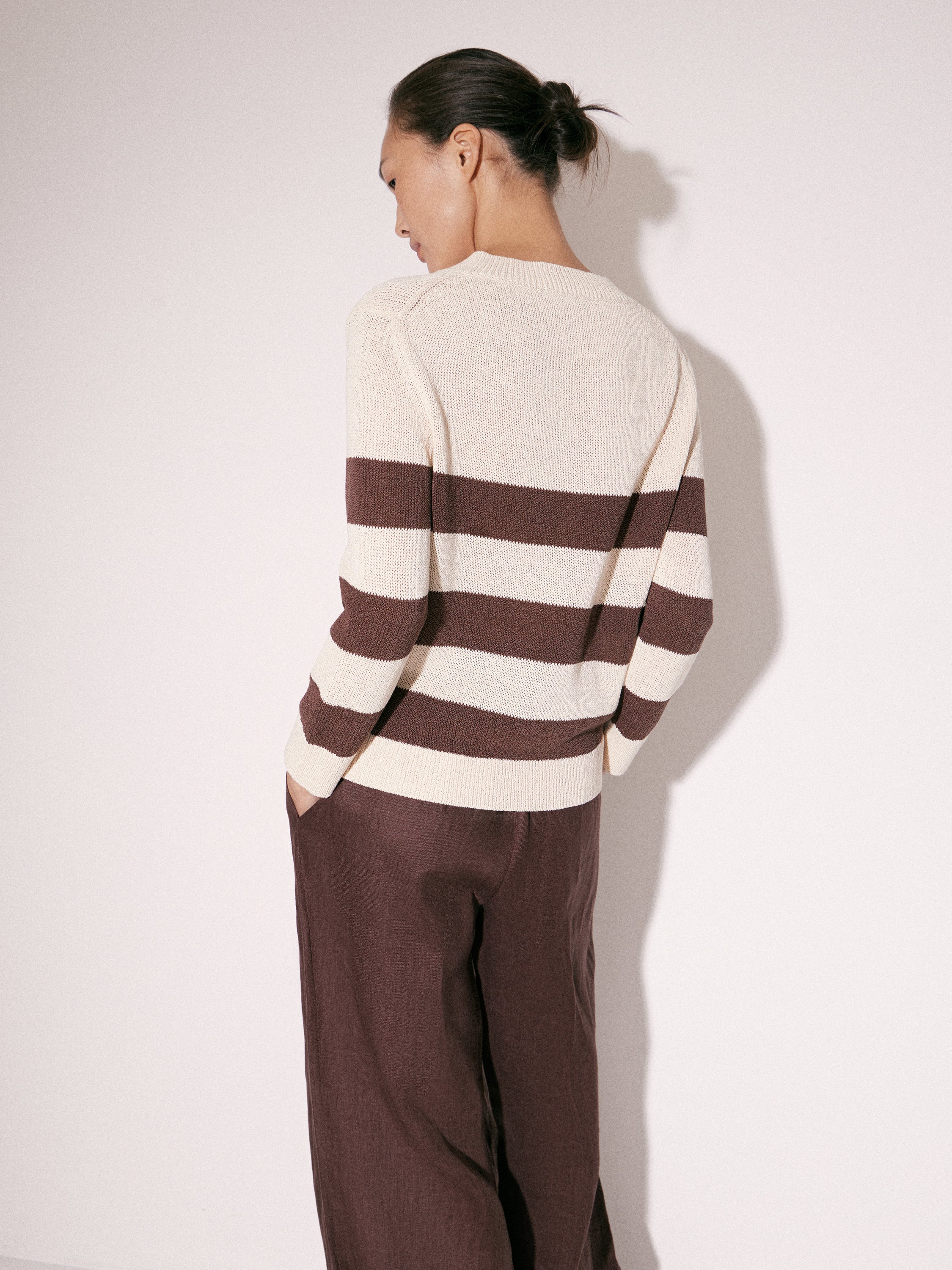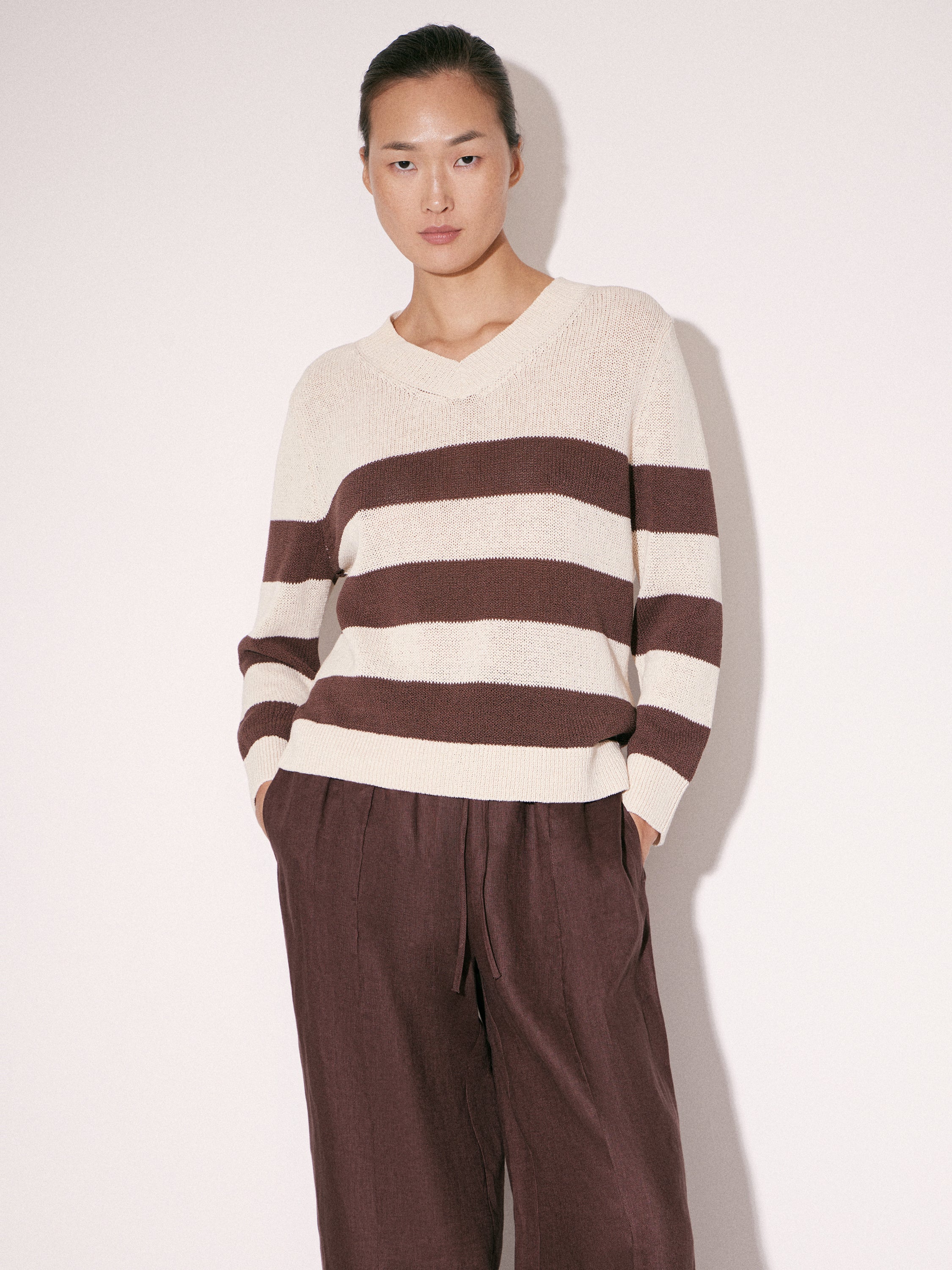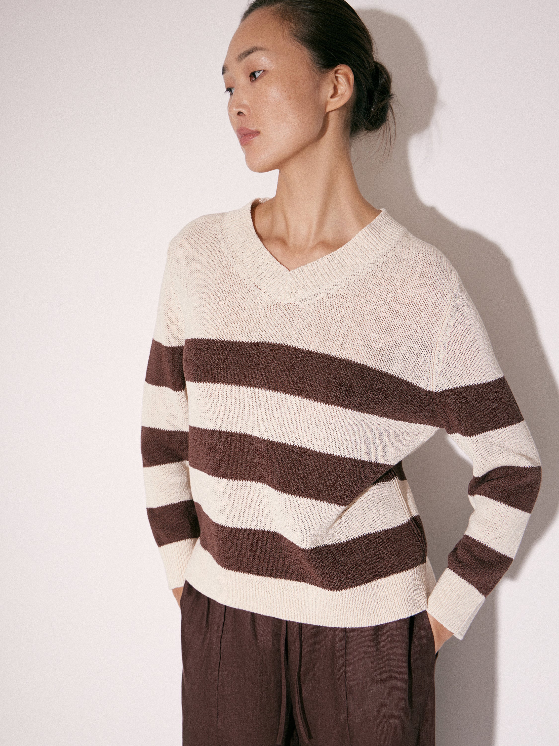 This knitted sweater comes in a soft milk-beige shade with contrasting horizontal stripes in a rich brown tone. Crafted from a cotton-blend knit with a smooth, even texture, it feels soft and comfortable for everyday wear. The silhouette is relaxed, with an easy fit and a subtly dropped shoulder line that adds to its effortless feel. A V-neckline is finished in a denser knit for a clean, structured look, while the cuffs and hem are also neatly defined without feeling tight. The striped pattern adds a graphic touch and gives the piece a modern rhythm. Easy to style with tailored trousers, denim, or skirts, it fits naturally into an everyday wardrobe.